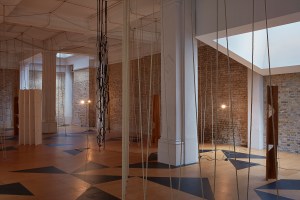 The exposed brick work on the walls and the linoleum floor design appropriated from a drawing by Mary Martin all envelope a warm exhibition. The title The Frisson of the Togetherness is derived from architects Alison and Christine Smithson’s description of young people’s social allegiance. There is much here to evoke the 1956 This is Tomorrow exhibition at The Whitechapel. The Smithsons were there as was the Hungarian, Erno Goldfinger, who’s influence pervades these works; The tensioned rope bannisters evoke Goldfingers house in Hampstead as do the window louvres in 2 Willow Road. The clean lines are created by jute, rope, brass and teak. There is much modern feminist work here and in the side gallery are small craft works such as a rug by Mary Martin, glasswork by Nanna Ditzel, and jewellery by Lucia Nogueira.