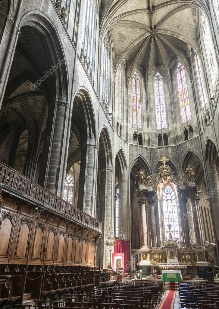 The cathedral of St Just et St Pasteur is particularly interesting comprising a choir, sanctuary, and apse ambulatory only. The gothic choir is stunning though and at over 130 feet high matches the great cathedrals around Paris. The apse contains several side chapels including a painted and sculptured dedication to Norte Dame as the axial chapel. Other chapels around the apse and choir are full of huge paintings and tapestries. Two other features are the magnificent altar canopy, many feet high, constructed in the seventeenth and the organ against the nave wall installed in the eighteenth centuries. So why no nave or transepts. Having completed the choir in 1332 the builders needed to remove some Roman ruins to complete the cathedral with two transepts and a seven bay nave. This was refused initially and after war and economic hard times the project was delayed and eventually abandoned. So the original work has been left as ruins abutting the choir wall. It does look a bit of a mongrel from this view but magnificent from inside the choir. And like Leon in Spain, superb from twenty miles away with the sun shining on the sandy pink stone.