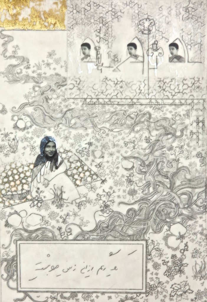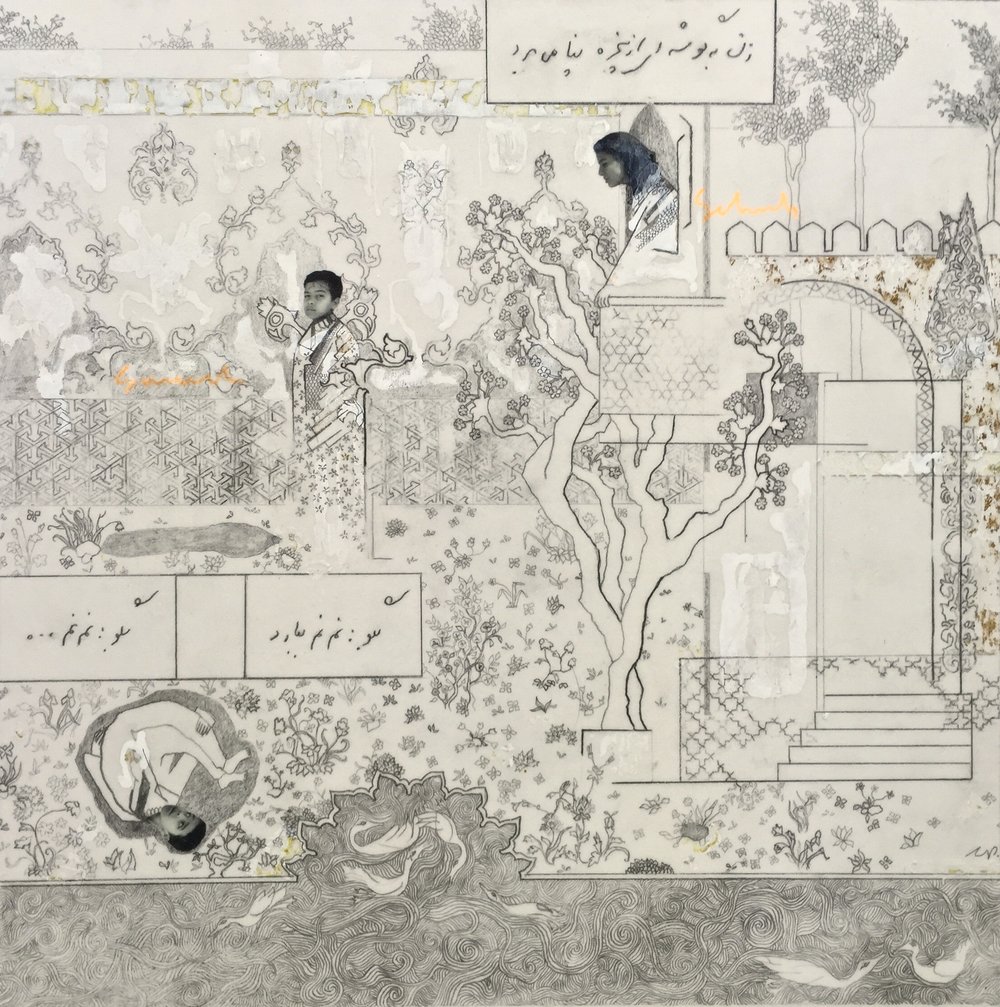 The Land I Stepped in, the title of the exhibition, concentrates on the timelessness of the Shah-Nama; how it’s philosophy is as true today as it was in the time of Ferdowsi, its author. But with its monochrome style, out of context titles and esoteric subjects, I also read into the artworks a challenge to the patriarchal aspect of the epic stories.