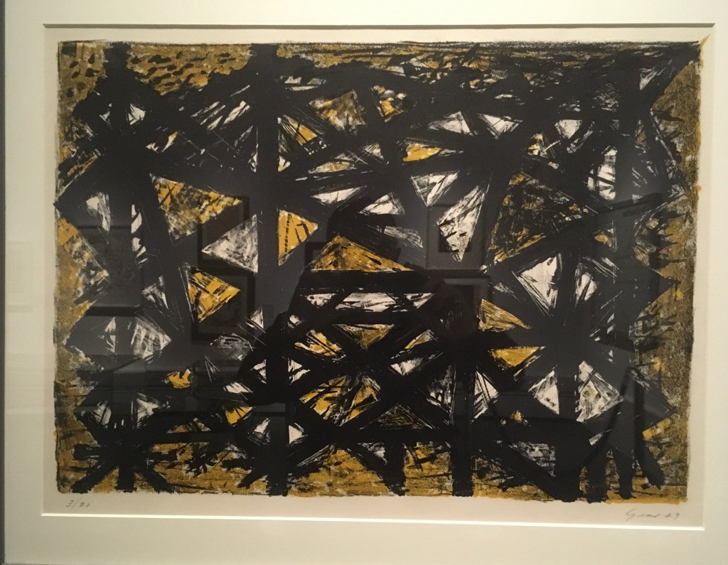 All are represented in this delightful exhibition spread over two rooms. The introductory piece by Bridget Riley sets the scene and is followed by a tour of some seventy pieces. I chatted with the supervisor about favourite pieces. Mine was a lithography by William Gear, a personal favourite. Gear, the son of a coal miner from Methil in Fife has always fascinated me with the juxtaposition of colours and the dark black lines of industry. Her choice was a much more sensual piece by Derrick Greaves, one of the “kitchen sink” artists, who also represented Britain in the 1950 Venice Biennale.
