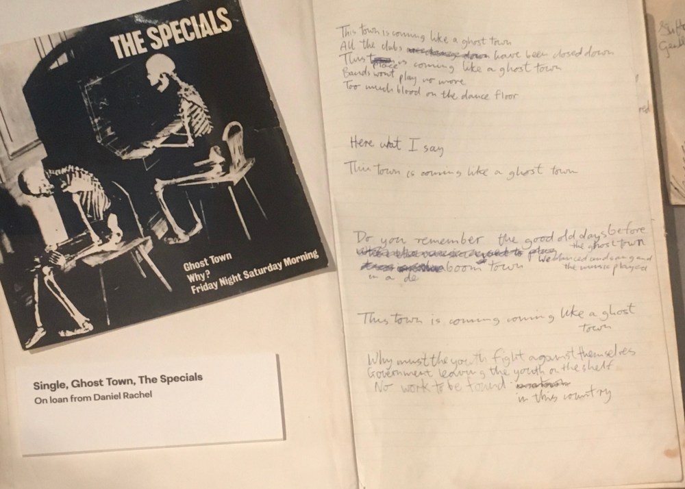 Much of the exhibition concentrates on a collection of Jerry Dammers material with some very interesting archive works. I found the notebook containing the early lyric composing of Ghost Town most illuminating. Ghost Town by the Specials , realeased in 1981, was the most successful Two Tone single achieving gold disc status.